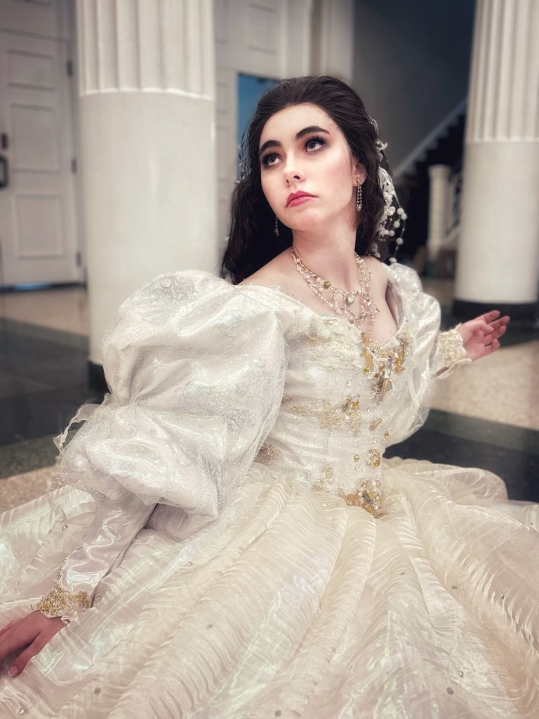Whew! This took months of work and it’s finally finished! This piece has three different skirts- a pannier hoop skirt, an underskirt made of tulle and satin, and an over skirt of pearl organza, lace, and cream crinkle organza- all made by me. The bodice is a boned canvas lining layer, then satin, pearl organza, appliqué and silver mesh. There are so many hand done embellishments everywhere that I could talk about for hours, but I hope you can look close at these pictures to see all the fun details!