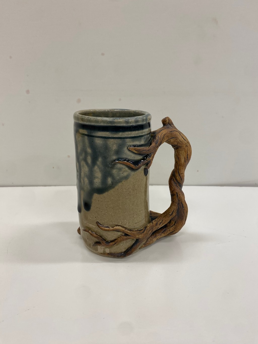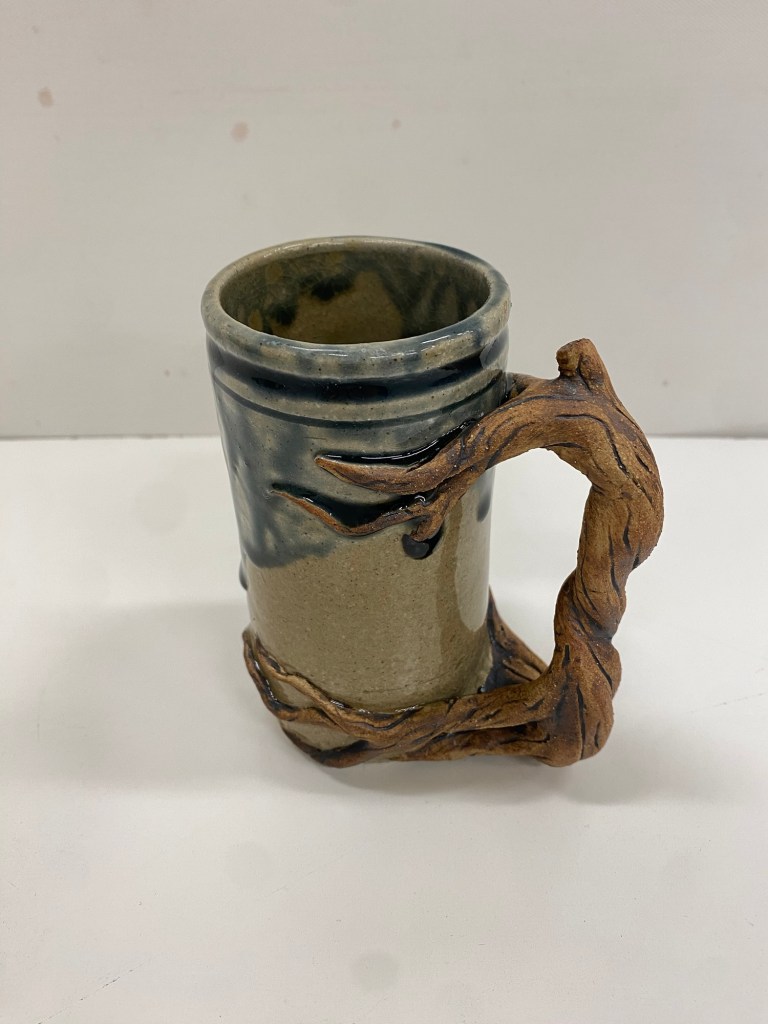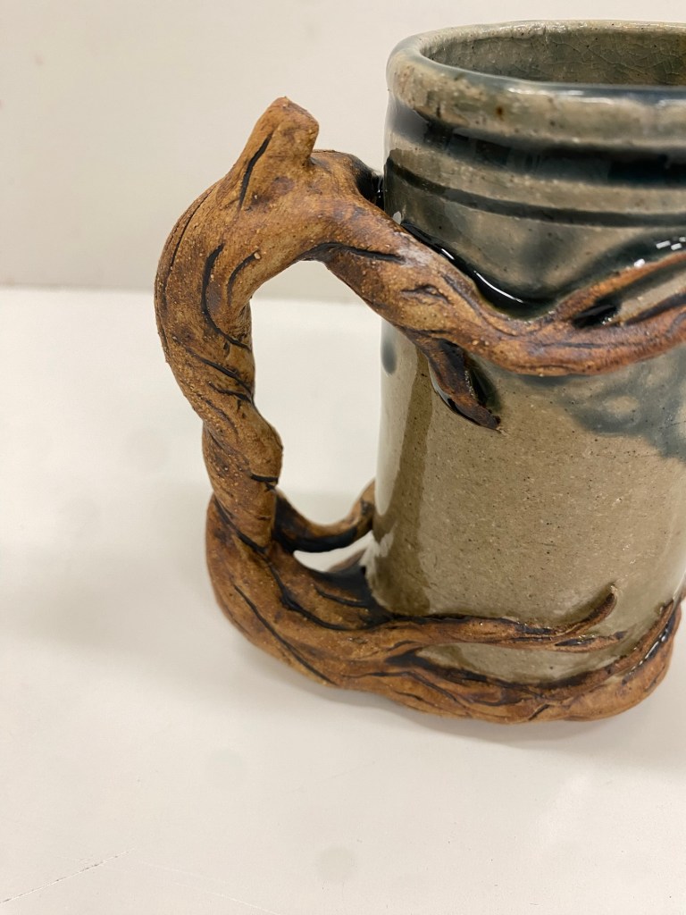 4 inch cylinder mug with root and tree handle. Wheel thrown and hand built Stoneware with high fire glaze and slip.