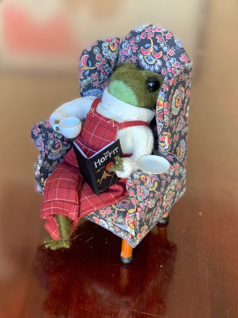 Needle felted frog with handmade chair. Wool, assorted fabrics, glass beads, particle board