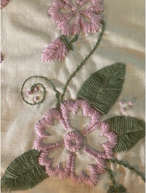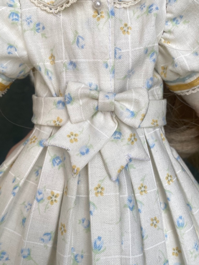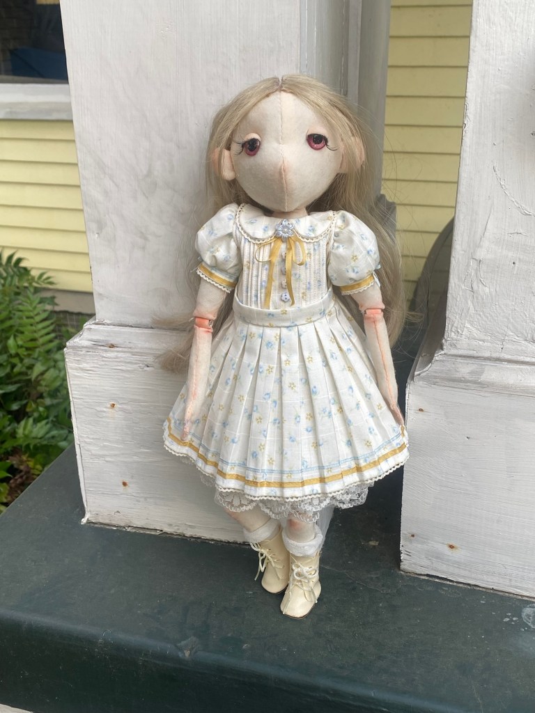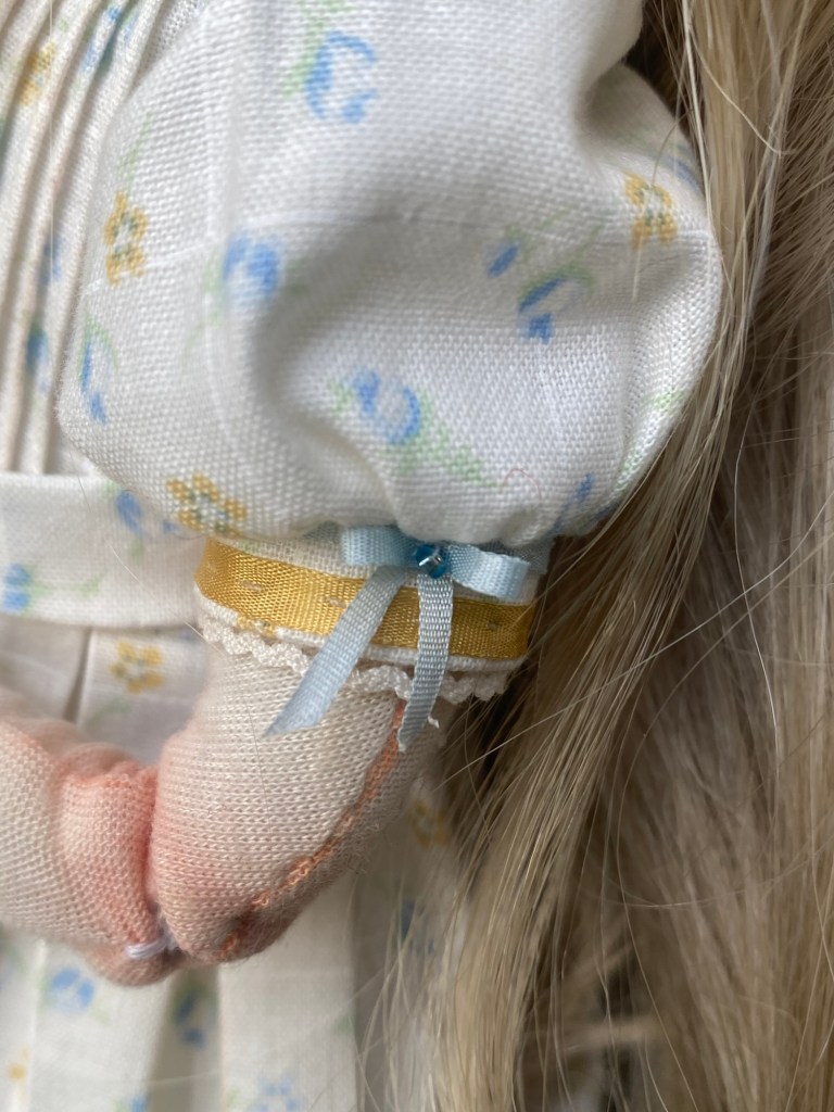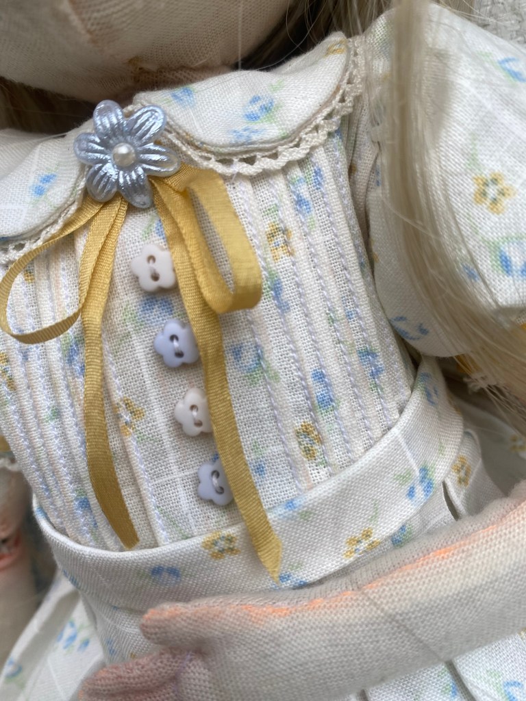 Handmade doll and dress. Cotton, hair fibers, silk trims, glass and wood beads