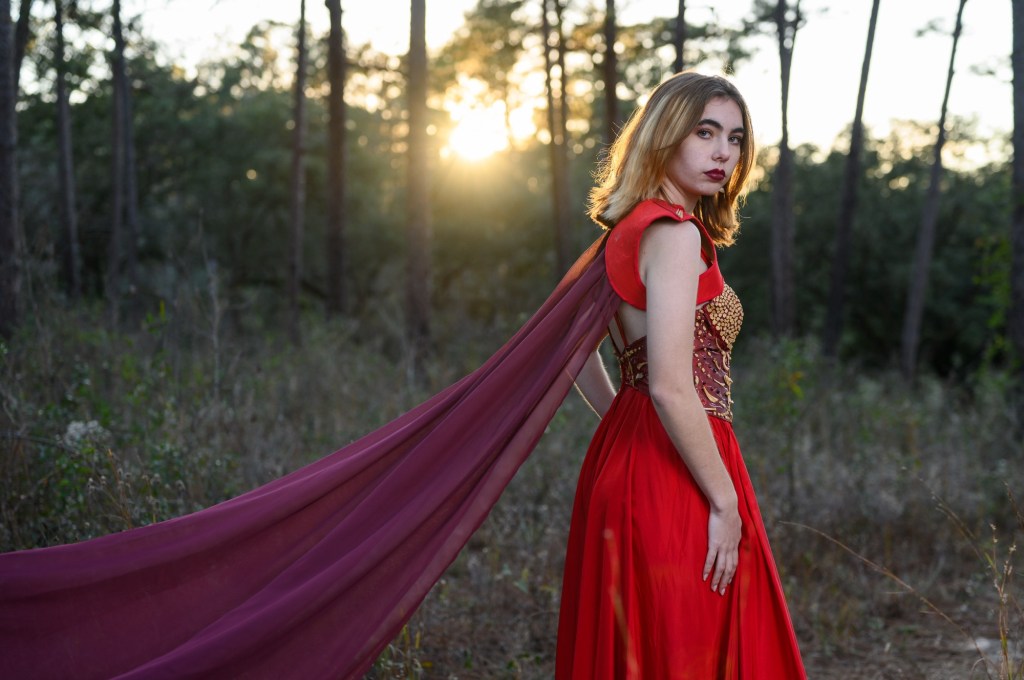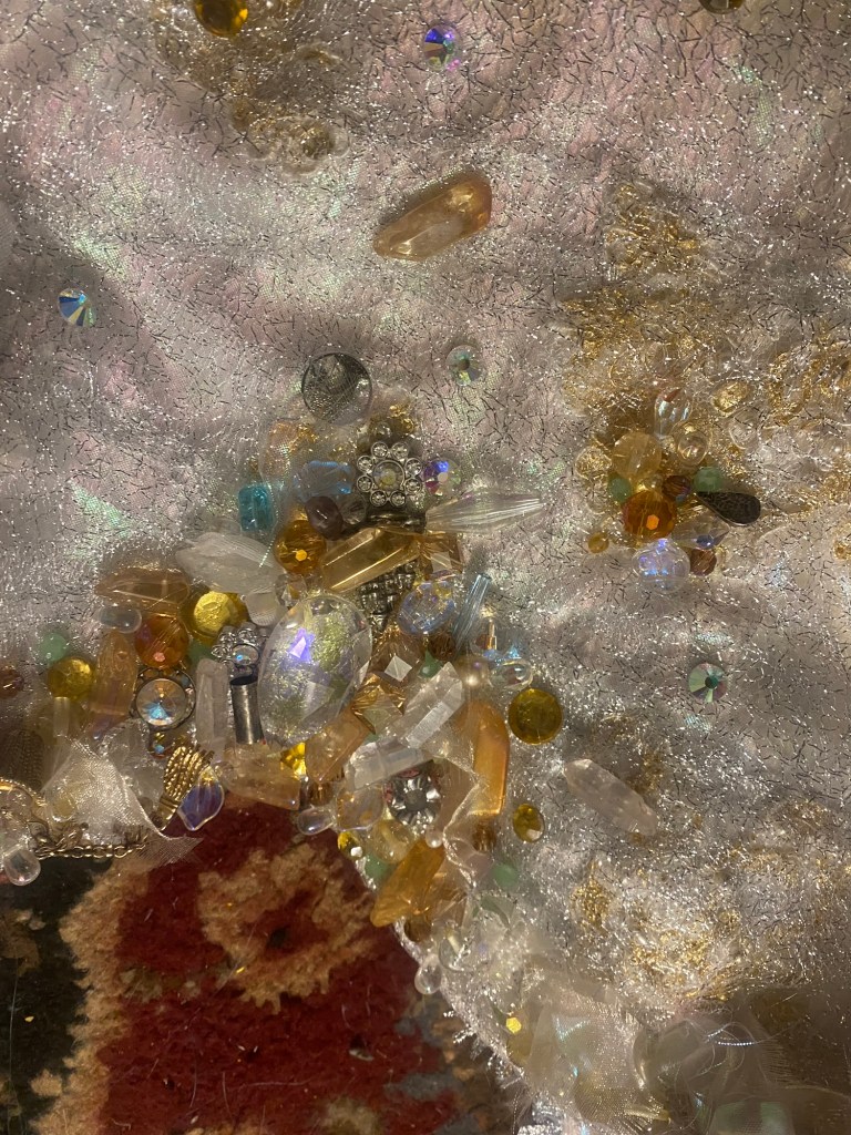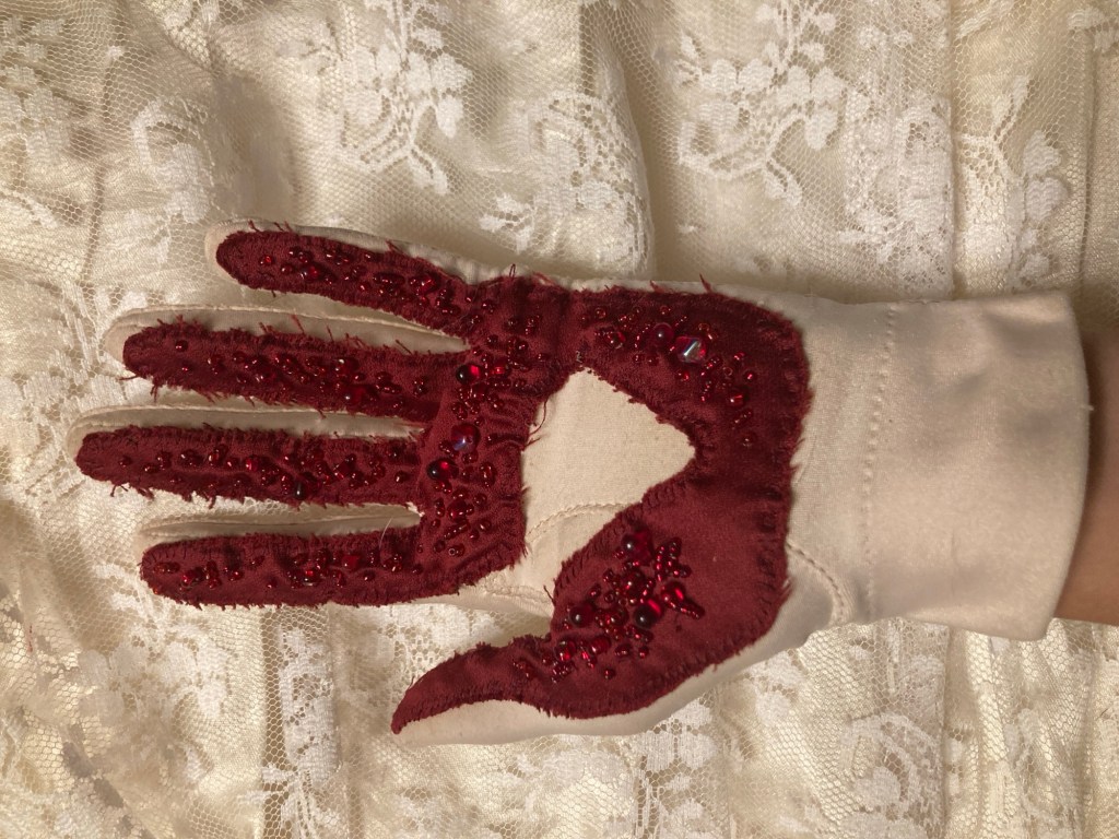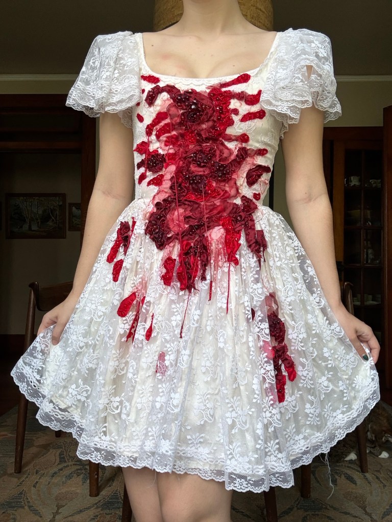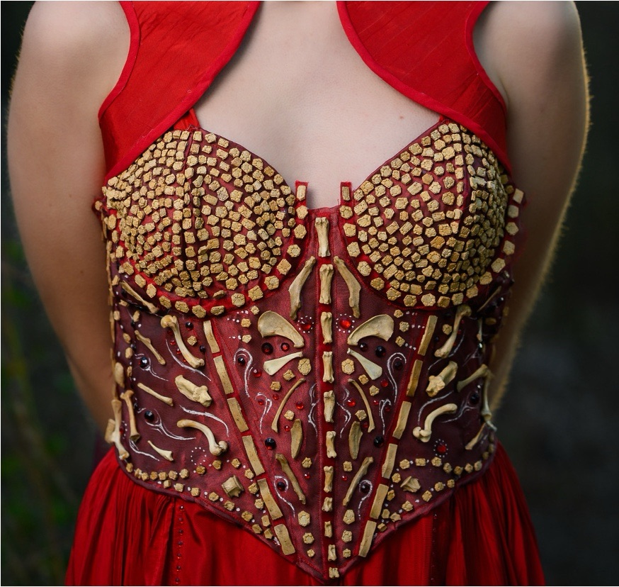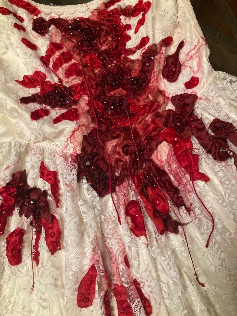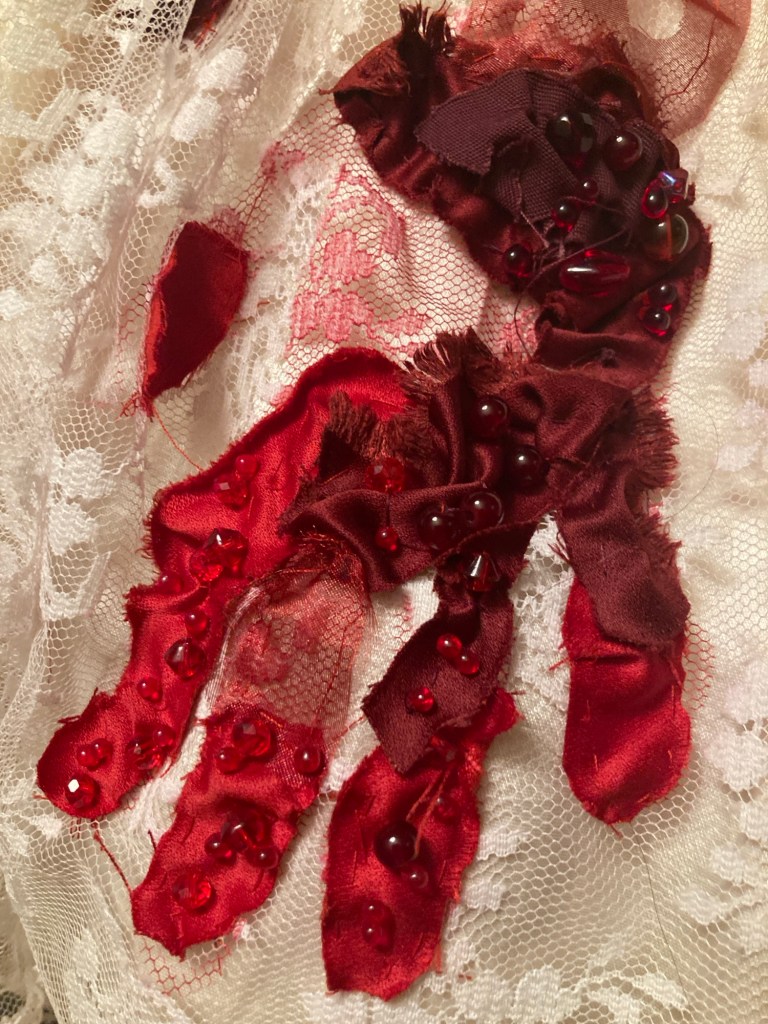 Embroidered and beaded Lady Macbeth inspired dress. Polyester silk, assorted red fabrics, beads, embroidery thread.