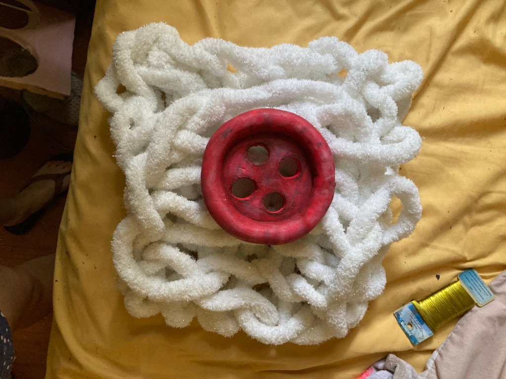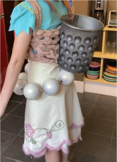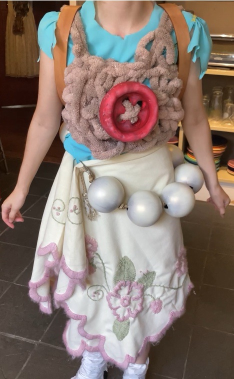 Original pixie costume. Yarn, linen, found objects, acrylic paint, foam, leather