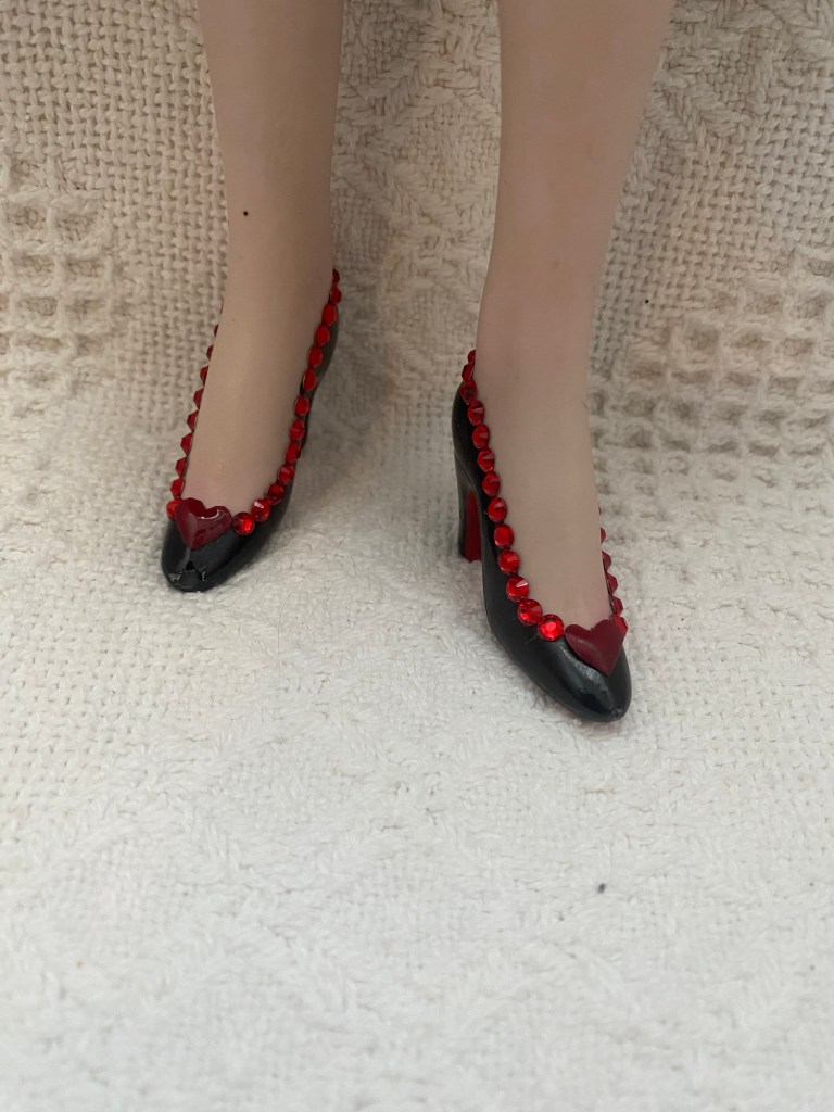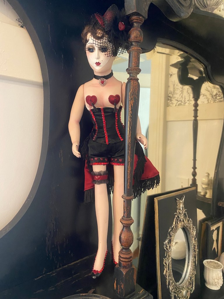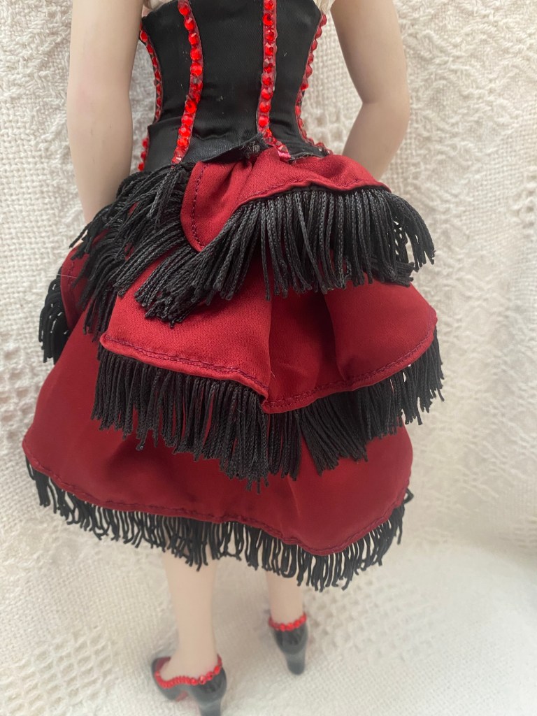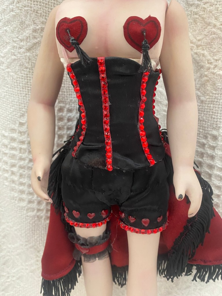 Original reworked porcelain doll. Polyester satin, faux suede, rhinestones, fringe
